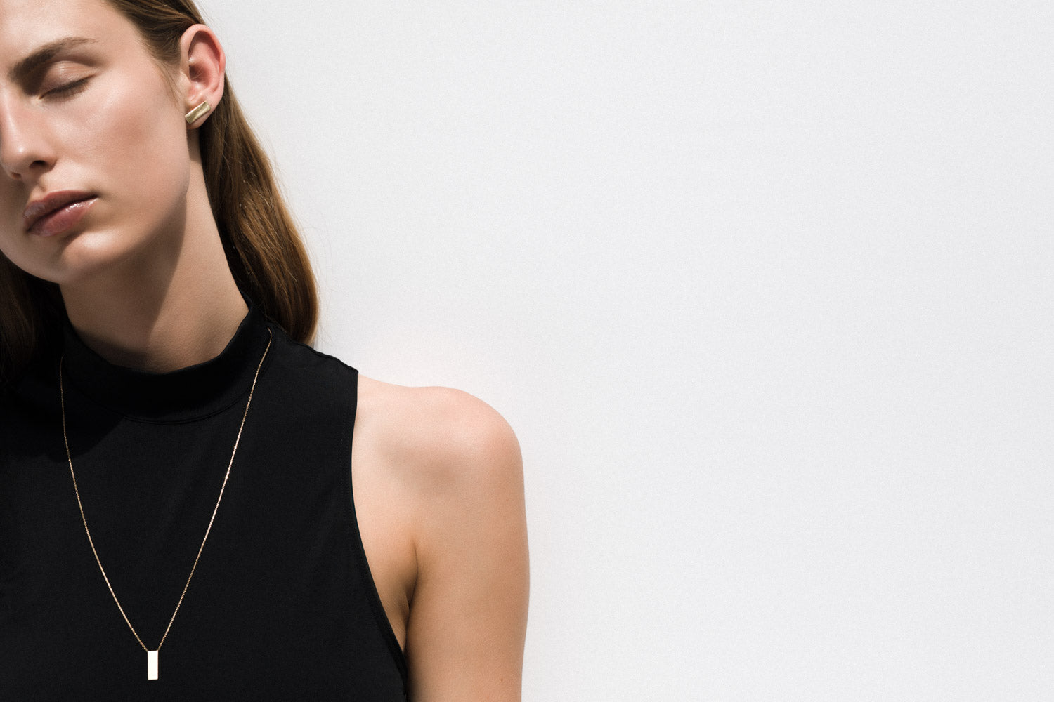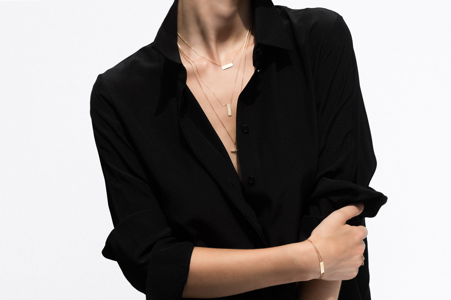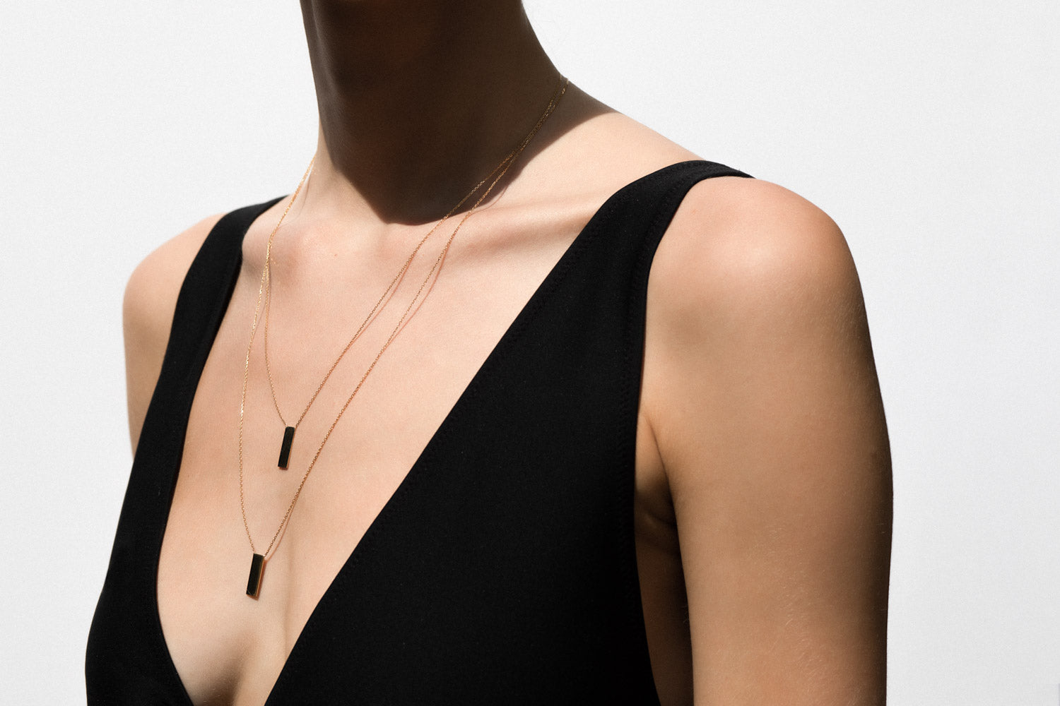 Le collier Cam V est une plaque ultra fine verticale, reliée par une chaîne discrète en forçat limé, en or 18 carats.
